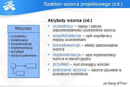Każdy wzorzec należący do katalogu zaproponowanego przez „Bandę Czterech” opisany jest przez zestaw atrybutów, dzięki którym jego właściwości są przedstawione w usystematyzowany, powtarzalny i obiektywny sposób. W ten sposób powstał szablon wzorca projektowego. Po kolei omówione zostaną pokrótce najważniejsze jego atrybuty.