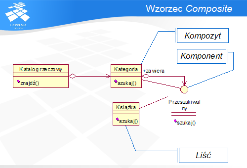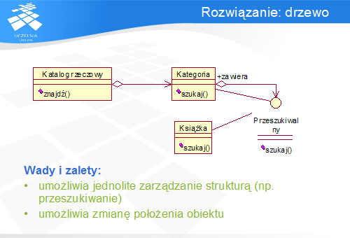 Naturalne rozwiązanie polega na stworzeniu wspólnego interfejsu, np. o nazwie Przeszukiwalny, który jest implementowany we wszystkich obiektach, które są częścią struktury i w których można szukać książek. Interfejs ten posiada dwie implementacje: Kategorię (która jest związana relacją agregacji z dowolną liczbą obiektów zależnych typu Przeszukiwalny, a zatem zarówno innych Kategorii, jak i Książek) oraz Książkę (reprezentującą element struktury, który nie posiada obiektów zależnych).