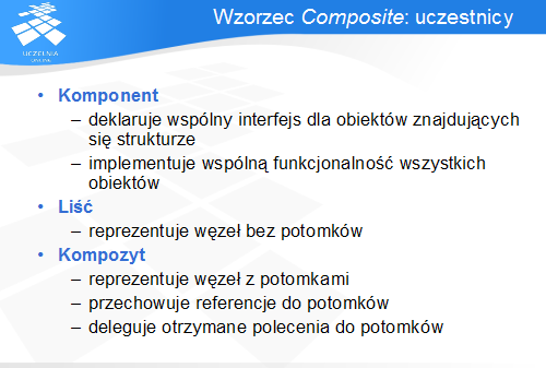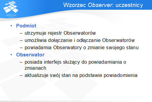 Lista uczestników wzorca zawiera nie tylko nazwy ról klas wchodzących w jego skład, ale przede wszystkim zakres ich odpowiedzialności oraz sposób zachowania. Jest to uszczegółowienie informacji, które są umieszczone na diagramie struktury.