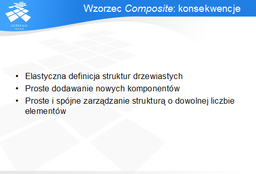 Popularność tego wzorca wynika z oferowanej przez niego możliwości elastycznego zarządzania złożonymi strukturami. Ponadto wszystkie elementy struktury realizują ten sam algorytm, co ułatwia ich testowanie.