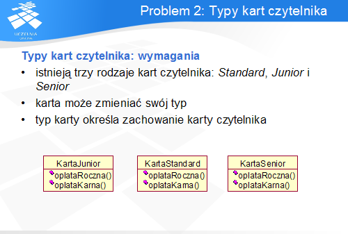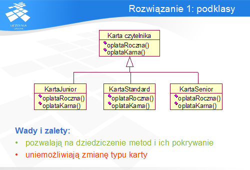 Pierwsze, niemal intuicyjne rozwiązanie polega na utworzeniu podklas reprezentujących rodzaje kart. Podklasy dziedziczą wspólne atrybuty i zachowanie po nadklasie stanowiącej ogólną Kartę Czytelnika, definiując jednak własny sposób wykonania niektórych metod (np. opłataRoczna () i opłataKarna ()). Z punktu widzenia zachowania programu jest to zatem rozwiązanie poprawne, które jednocześnie promuje ponowne użycie kodu poprzez wykorzystanie dziedziczenia.