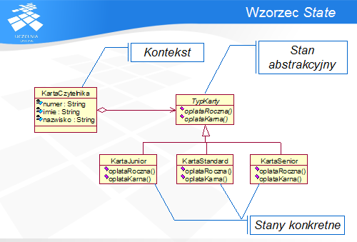 Rozwiązanie to jest znane jako wzorzec State. Wzorzec ten, podobnie jak inne wzorce, do opisania klas uczestniczących w nim posługuje się nazwami ról, jakie one w nim pełnią. KartaCzytelnika jest nazwana Kontekstem, abstrakcyjny TypKarty – Stanem Abstrakcyjnym, a jego podklasy – Stanami Konkretnymi.