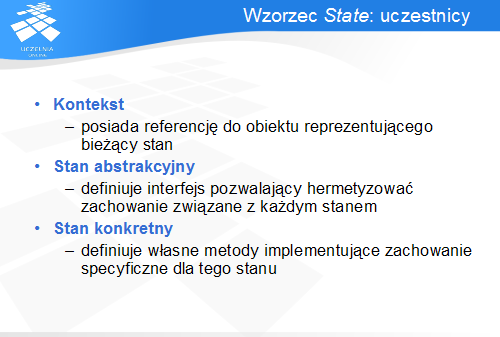 Obiekt Kontekst posiada referencję do obiektu typu Stan Abstrakcyjny, wskazującą na bieżący stan. W obiekcie Stan zdefiniowane są wszystkie metody, których zachowanie zależy od stanu obiektu Kontekst, natomiast Stany konkretne definiują te metody.