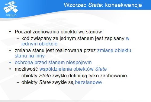 Ciekawa obserwacja dotyczy możliwości współdzielenia obiektów typu State. Jeżeli nie one przechowują informacji (a w większości przypadków może ona być zapamiętana w obiekcie Kontekst), a jedynie definiują zachowanie, wówczas – paradoksalnie – obiekty te, reprezentujące stan, są bezstanowe i mogą być współdzielone między wiele obiektów typu Kontekst.