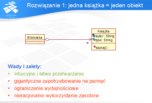 Pierwsze rozwiązanie jest intuicyjne i naturalne: każdej fizycznej karcie książki odpowiada jeden obiekt, tworzony w momencie, gdy jest potrzebny. Ten model charakteryzuje się prostym sposobem przetwarzania: w odpowiedzi na zapytanie (np. wyszukiwanie) obiekt zarządzający (biblioteka) tworzy niezbędną liczbę obiektów reprezentujących karty książki.