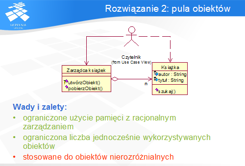 Rozwiązaniem, które usuwa wady poprzedniego, jest pula obiektów. Obiekt zarządzający tworzeniem obiektów-książek nie tworzy ich za każdym razem, gdy zażąda tego klient. Przechowuje on grupę aktywnych obiektów (właśnie pulę), które są przydzielane klientom w miarę ich potrzeb, a po wykorzystaniu zwracane do puli.