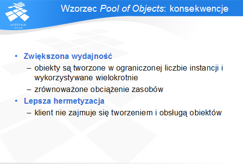 Ponadto, wzorzec ten poprawia także hermetyzację Obiektu: jego tworzeniem i konfiguracją zajmuje się Pula obiektów, natomiast Klient jedynie korzysta z usług oferowanych Obiekt.