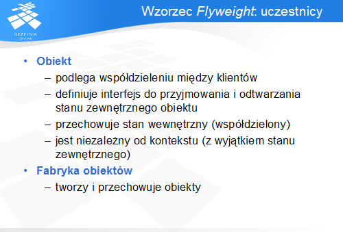 Obiektu, który umożliwia skonfigurowanie go danymi specyficznymi, oraz Fabryki obiektów, która stanowi (z punktu widzenia klienta) logiczny konstruktor obiektów. Fabryka ta posiada pamięć (pulę obiektów), w której przechowuje utworzone wcześniej, anonimowe instancje. Zajmuje się także zapisem i odtwarzaniem (serializacją i deserializacją) stanu zewnętrznego obiektu.