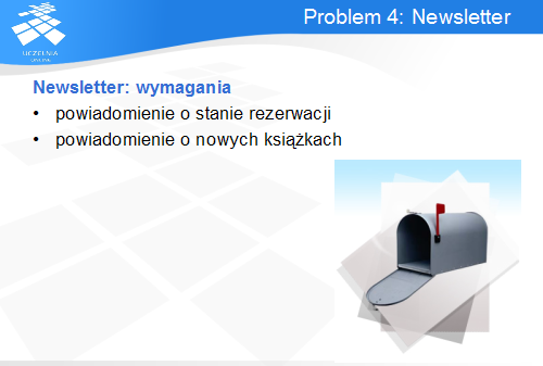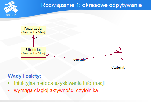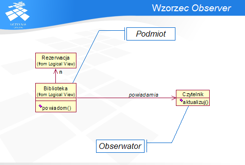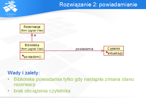 Rozwiązanie to znane jest jako wzorzec o nazwach Observer lub Listener. Biblioteka pełni rolę Podmiotu – obiektu, którego stan jest obserwowany, natomiast Czytelnik jest jego Obserwatorem. Czytelnik wyraża zainteresowanie powiadomieniami, rejestrując się Bibliotece jako Obserwator. W efekcie Biblioteka wywołuje wspólną metodę wszystkich Obserwatorów (aktualizuj ()) na rzecz każdego zarejestrowanego Obserwatora.